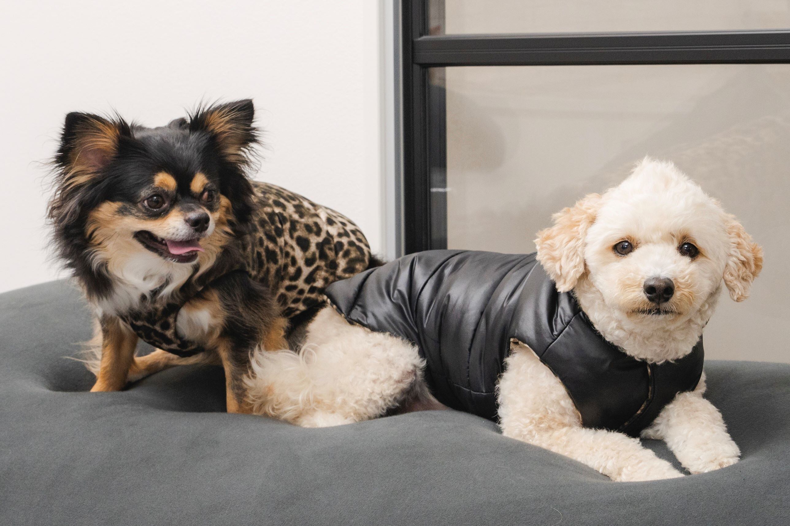 ヒョウ柄はマイクロサテン生地、黒無地はナイロンタフタ生地を使用してます。