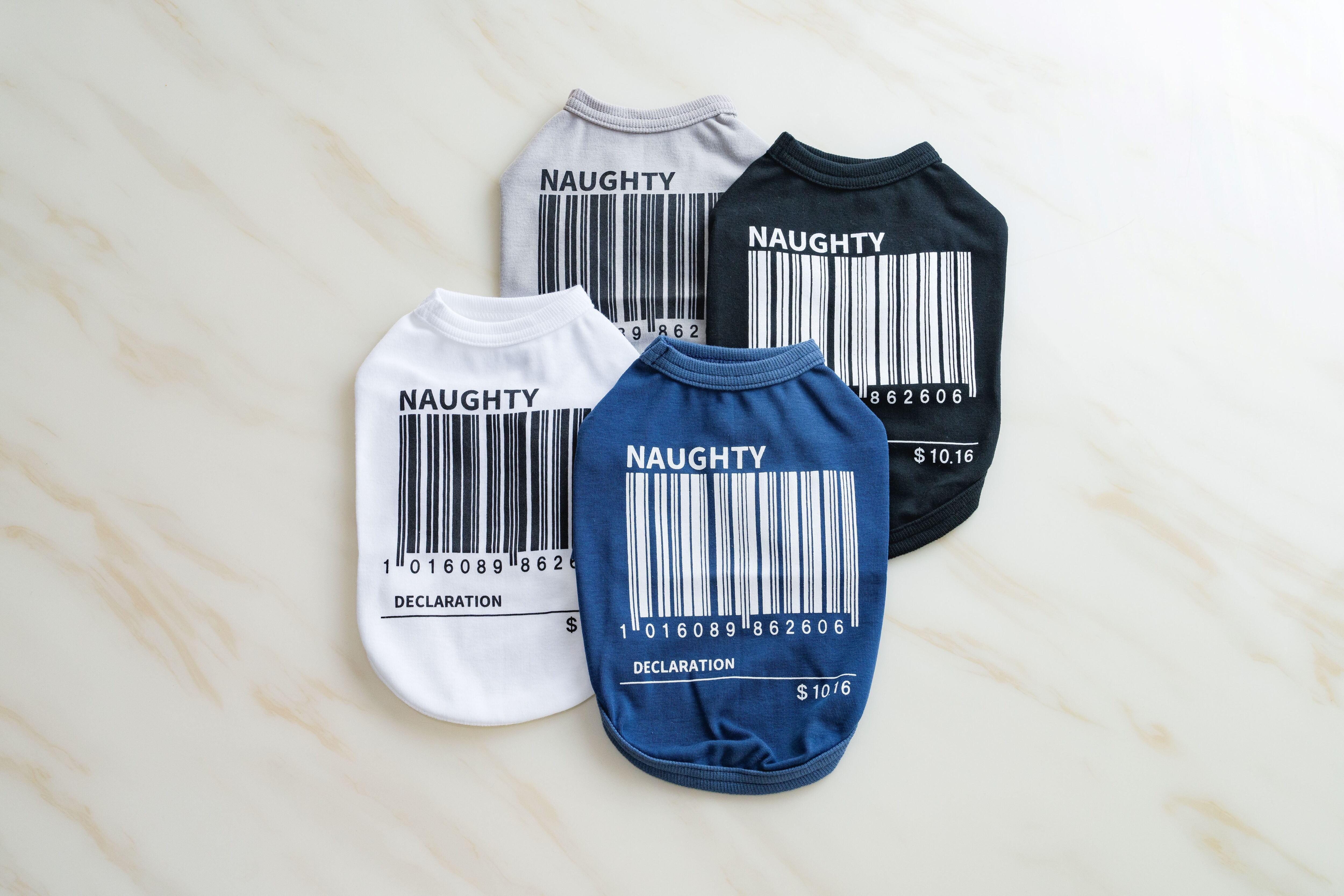 バーコードと英語で ”やんちゃ宣言”とプリントしました。1枚でも格好良いですがパンツ、スカートとの相性も良いと思います。